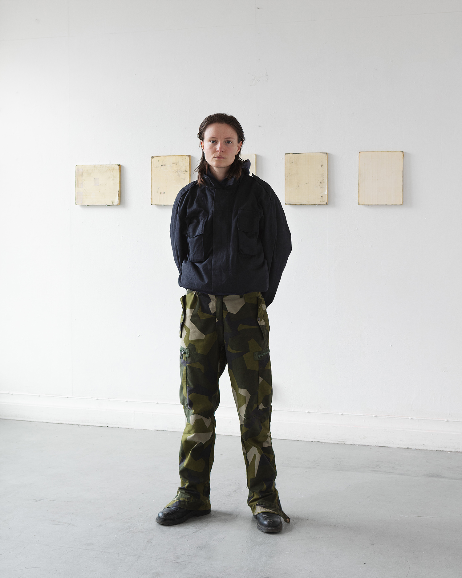 Tova Nyberg (b.1993, Uppsala) employs mixed media to explore areas of strong personal ambivalence. One such area is military aesthetics, warfare and Sweden’s role in the global arms industry. While the areas of investigation as well as medium may vary, conflict remains the point of interest.