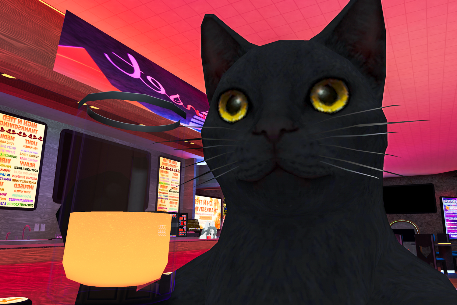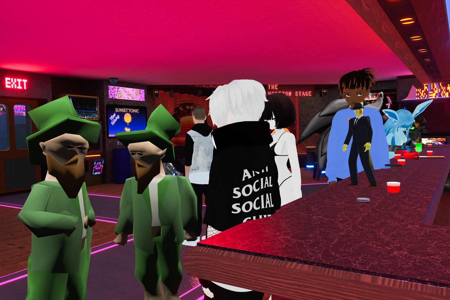 Sunset Bar explores the virtual bar with the same name. It is one of many user-created worlds on the social virtual platform VRChat. The platform resembles a video game, but its purpose is to meet and socialize without being physically present.