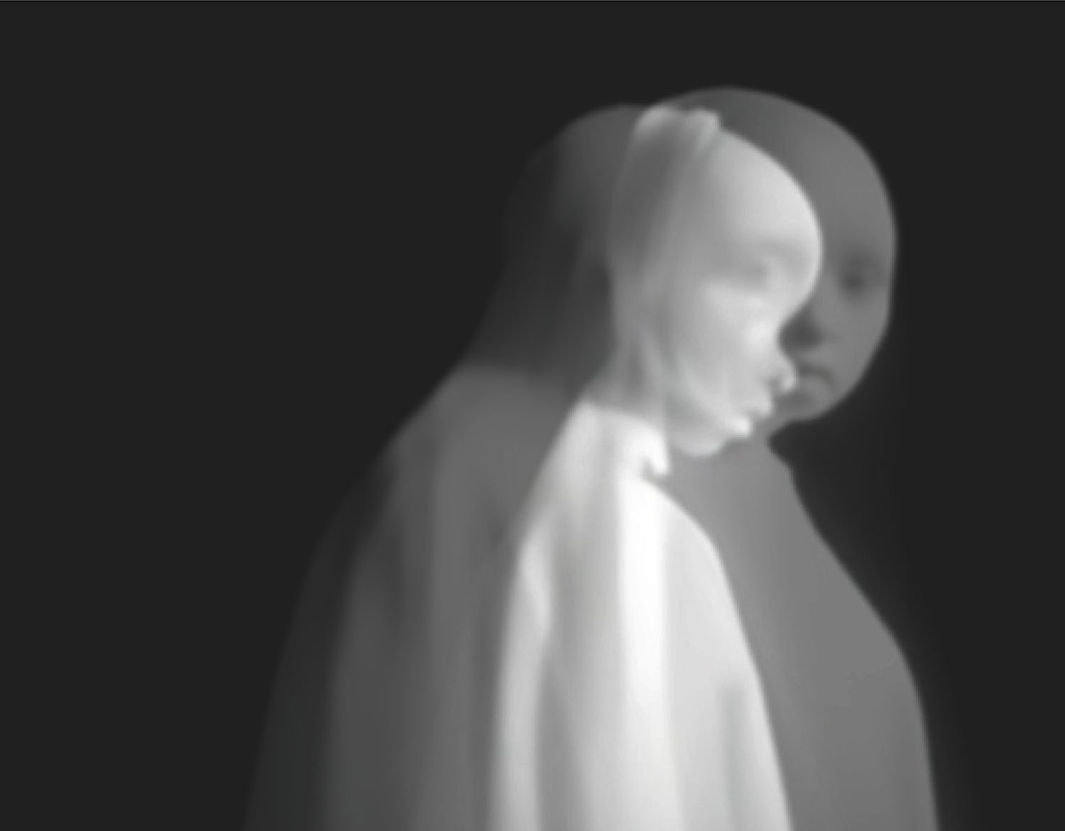 Verket kretsar kring en gestalt i rörelse mellan framträdelse och undandragande. Likt en pulserande andning hålls bilden mellan uppenbarelse och upplösning. I mjölkig, membranlik yta dröjer bilden i väntan, ännu inte helt synlig.