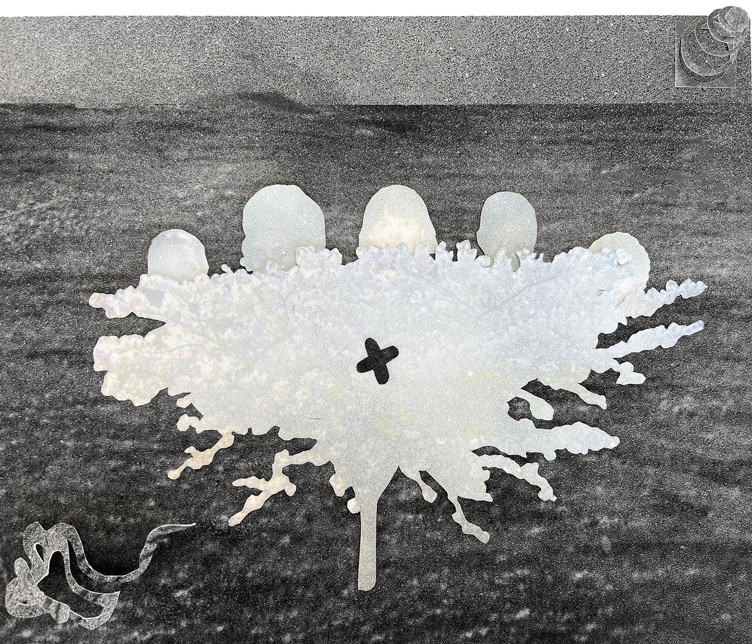 The work centres on a form in motion between emergence and withdrawal. Like a pulsing breath, the image is held between revelation and dissolution. Within a milky, membrane like surface, the image lingers in waiting, not yet fully visible.