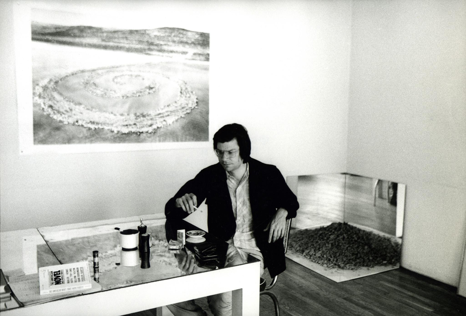 Til venstre ser vi et bilde der Robert Smithson er avfotografert i sitt studio, han sitter med et fotografi av Spiral Jetty og et non-site skulptur i bakgrunnen. Dette fotografiet beskriver også en form av dokumentert tid, i prosess av skapende, bare mer subtil. Vi får et blikk i hans daglige omgivelser der jeg kan se et glimt av tidsperioden hvor røyking innendørs var vanlig, boken The American Novel var kanskje den han leste for inspirasjon da. Hvem vet? Det jeg er sikker på er hvordan fotografiet får meg til å tenke på det samme prinsippet om tid som det fotografier av land art gjør.