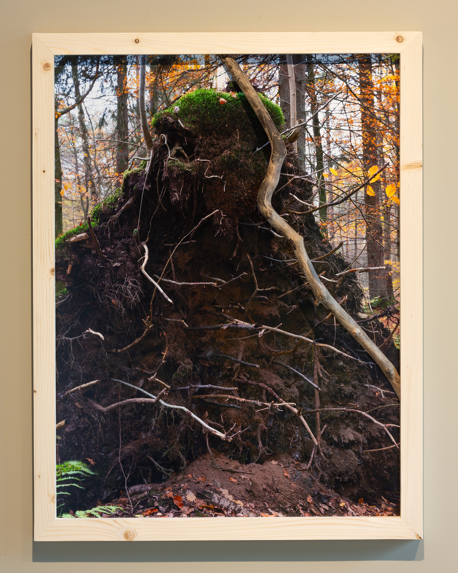 Når jeg selv skaper og fotograferer min egen land art ser jeg etter perspektiver der motivet vil kunne framheve skulpturens forgjengelighet og hvordan naturen kan komme til å forandre den på langsikt. Når plassen jeg har valgt ikke lenger er synlig fordi jeg har re-artikulert skulpturen til en to-dimensjonal fotografi er det viktig for meg at plassens minne fortsatt er til stede i mine verk. Dette har jeg utforsket ved å kombinere materialer (grener) fra plassen i kombinasjon med mine fotografiske verk som jeg oftest presenterer i et galleri rom. Motivet av grener plassert lekefult i en rotvelt har den samme grenen intrigert i rammen. Dette håper jeg kan bygge en bro mellom den fysiske plassen og non-site verket (altså fotografiet).